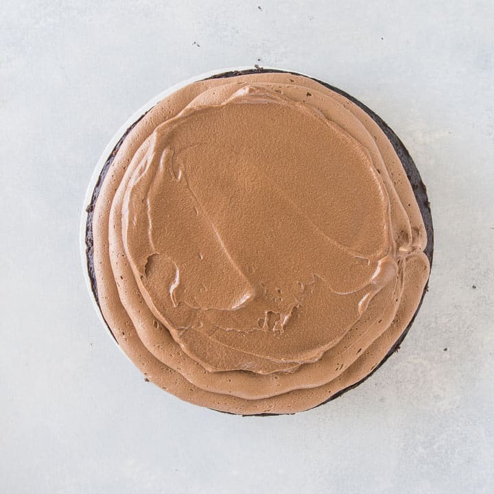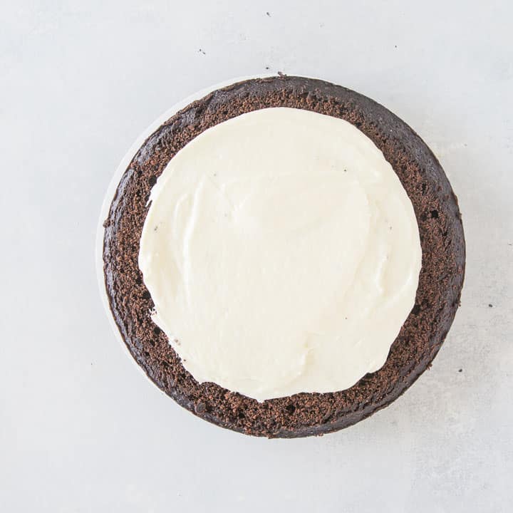 • Spread half of the white chocolate mixture over the top of one of your cake layers. Don’t go all the way to the edge—this makes frosting your cake easier because you don’t have to worry about any filling seeping out into the chocolate frosting.
