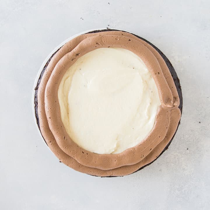 overhead shot of frosting piped around the edge of one of the tuxedo cake layers