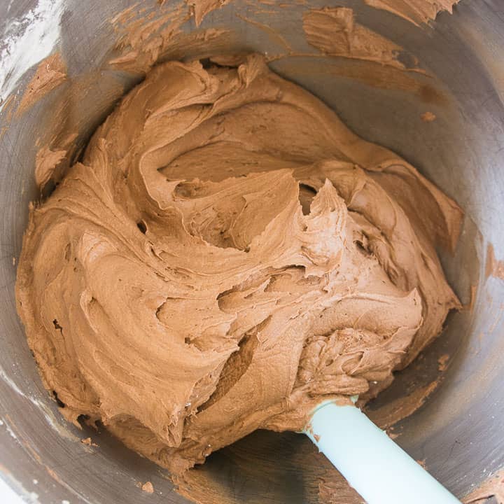 overhead shot of buttercream frosting for the tuxedo cake